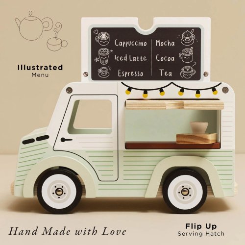 Mobilná kaviareň Street coffee. Táto štýlová dodávka vo vintage dizajne je vyrobená z FSC® certifikovaného dreva, natretá jemnou pistáciovo zelenou a bielou farbou. Vďaka krásne spracovaným detailom a ilustráciám po všetkých stranách zaujme na prvý pohľad. Strieška sa dá ľahko otvoriť - vo vnútri sa ukrýva menu s ponukou kávy a čaju. Predné výdajné okienko zase umožňuje malým baristom obsluhovať svojich zákazníkov ako v skutočnej pojazdnej kaviarni. Hlavné vlastnosti: retro kaviarenská dodávkaservírovacia tácka s hrnčekom a croissantomotočná strieška a otváracie okienkovy vyrobené z FSC® dreva testované podľa najprísnejších štandardov farbené netoxickými farbami na báze vody inšpiruje ku kreatívnej a predstavivej hre Podporuje rozvoj detí vďaka hraniu Council) zaručuje, že drevo, z ktorého bol produkt vyrobený, nebolo vyťažené nelegálne a pochádza z lesov obhospodarovaných šetrným či prírode blízkym spôsobom, v ktorom sú dodržiavané prísne environmentálne a sociálne požiadavky. Značka FSC® na výrobku znamená, že svojim nákupom pomáhate chrániť lesy a podporujete šetrné, zodpovedné či prírode blízke hospodárenie, vďaka ktorému sú naše lesy stabilnejšie, zdravšie, majú prirodzenú druhovú skladbu a lepšie odolávajú negatívnym následkom klimatických zmien.
