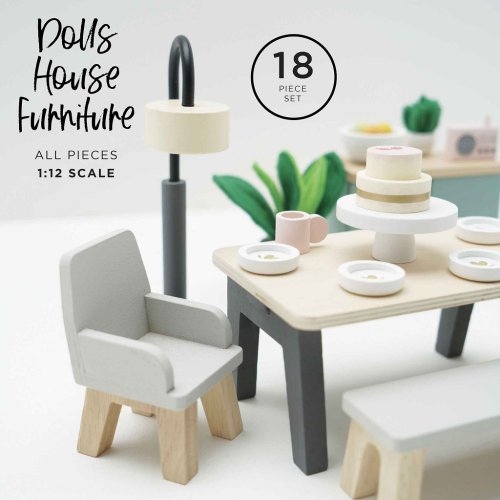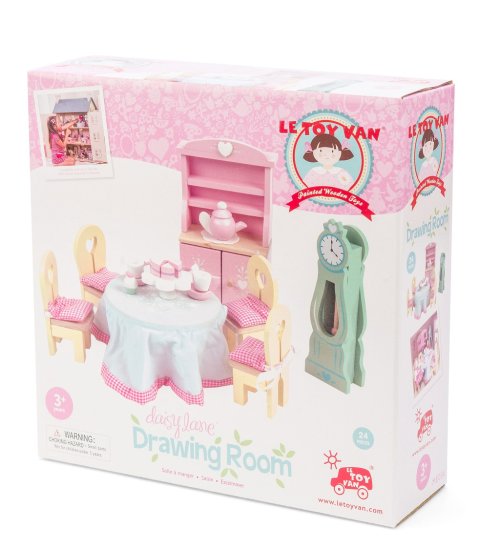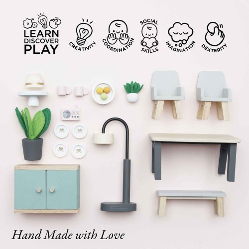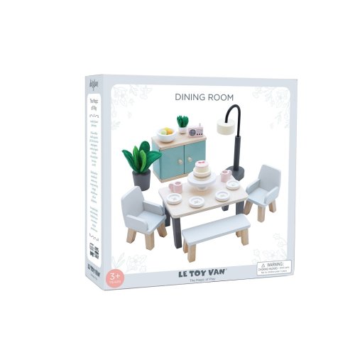 Pokochajte sa týmto úžasným detským jedálenským setom s nádychom modernej elegancie, ktorý je dokonalým doplnkom do každého miniatúrneho domčeka pre bábiky. Štýlová a udržateľná je táto 18dielna sada vyrobená z FSC ® certifikovaného dreva. Drevený stôl s dvoma kreslami a lavicou, dopĺňa voľne stojaca lampa, príborník, 2 rastliny s realistickými plstenými listami, misa na ovocie s dreveným ovocím, rádio, 4 jedálenské taniere s dvoma hrnčekmi a tiež vynikajúca torta naaranžovaná na stojane na pokušenie malých hostí . Táto sada je kompatibilná s naším radom úžasných domčekov pre bábiky. Hračky s účelomVšetky hračky firmy Le Toy Van sú vyrobené s cieľom - aby dlho vydržali. Dizajnované s láskou skúsenými remeselníkmi za použitia etických praktík a udržateľných materiálov, ktoré sú láskavejšie k našej planéte. Hlavné vlastnosti: vybavenie jedálne z radu nábytku Daisylanekompatibilné so všetkými našimi domčekmi Le Toy Van Dollsvytvorte si s týmto setom vlastné príbehyinšpiruje k sociálnej hre, rozvíja komunikačné zručnostidekorované pomocou netoxických farieb na vodnej bázevyrobené s certifikáciou FSC® Daisylane kolekcie: firmy Le Toy Van. Pred viac ako 25 rokmi zakladateľ Georges navrhol svoj úplne prvý domček pre bábiky, stavebný kameň tejto firmy. Vyrobené eticky z udržateľných materiálov, drevené domčeky pre bábiky Daisylane sú jedinečné a nebudú detskú predstavivosť držať späť. Rodinné dedičstvo, skutočná investícia do hrania. Značka a certifikát FSC® (Forest Stewardship Council) zaručuje, že drevo, z ktorého bol produkt vyrobený, nebolo vyťažené nelegálne a pochádza z lesov obhospodarovaných šetrným či prírode blízkym spôsobom, v ktorom sú dodržiavané prísne environmentálne a sociálne požiadavky. Značka FSC® na výrobku znamená, že svojim nákupom pomáhate chrániť lesy a podporujete šetrné, zodpovedné či prírode blízke hospodárenie, vďaka ktorému sú naše lesy stabilnejšie, zdravšie, majú prirodzenú druhovú skladbu a lepšie odolávajú negatívnym následkom klimatických zmien.