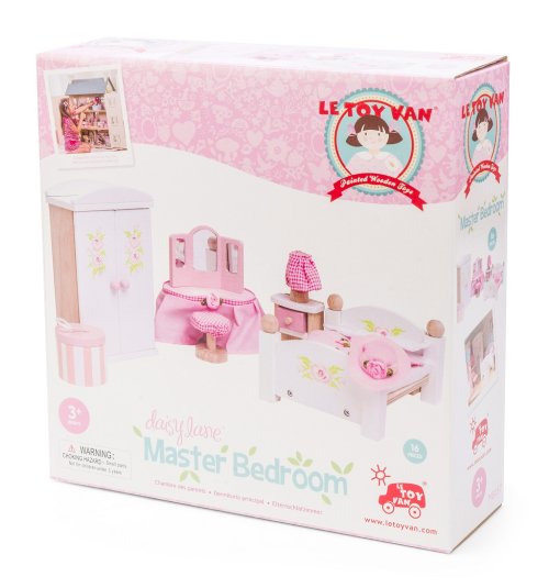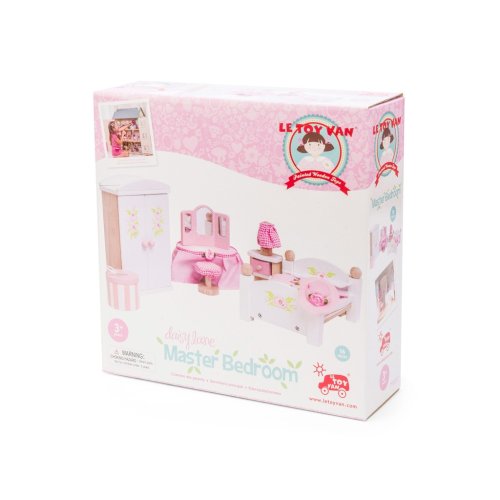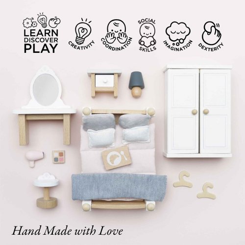 Táto miniatúrna sada do spálne je skutočným splneným snom. S klasickým dizajnom v krásnych neutrálnych tónoch je kompatibilný so všetkými našimi drevenými domčekmi pre bábiky a je úžasným doplnkom každej detskej izby. Pokojný spánok láka vďaka pohodlnej manželskej posteli, doplnenej útulnou prikrývkou a mäkkými vankúšmi. To všetko doplnené štýlovým prikrývkou a dreveným podnosom na podávanie chutných raňajok v posteli. Nechýba ani múdra šatníková skriňa s vešiakmi na kabáty, nočný stolík s lampičkou a navyše nádherný toaletný stolík, taburet a doplnky . Hlavné vlastnosti: vytvorte si s týmto setom vlastné príbehyinšpiruje k sociálnej hre, rozvíja komunikačné zručnostivyrobené z udržateľného FSC® drevamaľované netoxickými farbami Daisylane kolekcie: Prestížna kolekcia domčekov pre bábiky a doplnkov firmy Le Toy Van. Pred viac ako 25 rokmi zakladateľ Georges navrhol svoj úplne prvý domček pre bábiky, stavebný kameň tejto firmy. Vyrobené eticky z udržateľných materiálov, drevené domčeky pre bábiky Daisylane sú jedinečné a nebudú detskú predstavivosť držať späť. Rodinné dedičstvo, skutočná investícia do hrania. Značka a certifikát FSC® (Forest Stewardship Council) zaručuje, že drevo, z ktorého bol produkt vyrobený, nebolo vyťažené nelegálne a pochádza z lesov obhospodarovaných šetrným či prírode blízkym spôsobom, v ktorom sú dodržiavané prísne environmentálne a sociálne požiadavky. Značka FSC® na výrobku znamená, že svojim nákupom pomáhate chrániť lesy a podporujete šetrné, zodpovedné či prírode blízke hospodárenie, vďaka ktorému sú naše lesy stabilnejšie, zdravšie, majú prirodzenú druhovú skladbu a lepšie odolávajú negatívnym následkom klimatických zmien.