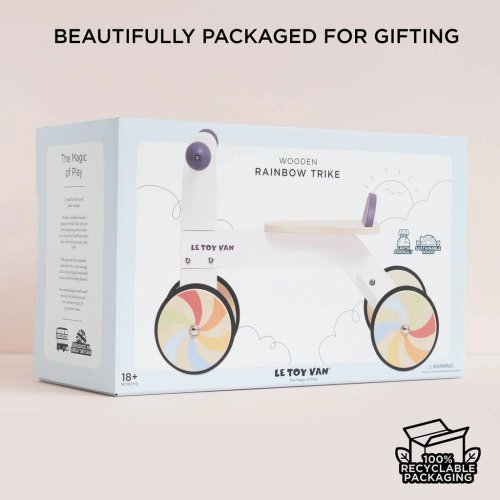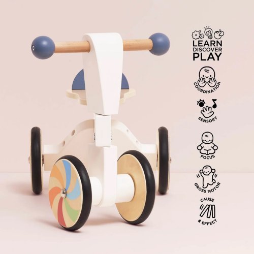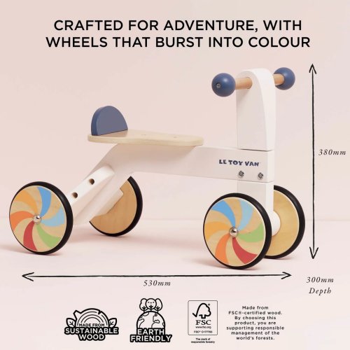 Štýlová jazda pre malých objaviteľov . Toto krásne navrhnuté odrážadlo je vyrobené eticky z udržateľného FSC® dreva. Zaujme svojim elegantným farebným prevedením a kolieskami vo farbe dúhy. Vďaka pohodlnému sedátku a ľahko ovládateľným riadidlám je ideálny pre prvé samostatné prechádzky malých detí. Štýlový a zábavný dopravný prostriedok, ktorý podporuje aktívny pohyb a zároveň pomáha rozvíjať rovnováhu a koordináciu. Hlavné vlastnosti: vyrobené eticky z udržateľného FSC® dreva testované podľa najprísnejších štandardov maľované netoxickými farbami na báze vody inšpiruje k predstavivej hre rozvíja kognitívne zručnosti Značka a certifikát FSC® (Forest Stewardship Council) zaručuje, že drevo, z ktorého bol produkt vyrobený, nebolo vyťažené prírode blízkym spôsobom, v ktorom sú dodržiavané prísne environmentálne a sociálne požiadavky. Značka FSC® na výrobku znamená, že svojim nákupom pomáhate chrániť lesy a podporujete šetrné, zodpovedné či prírode blízke hospodárenie, vďaka ktorému sú naše lesy stabilnejšie, zdravšie, majú prirodzenú druhovú skladbu a lepšie odolávajú negatívnym následkom klimatických zmien.
