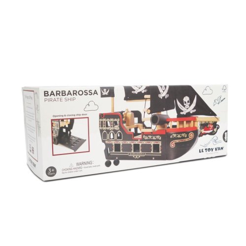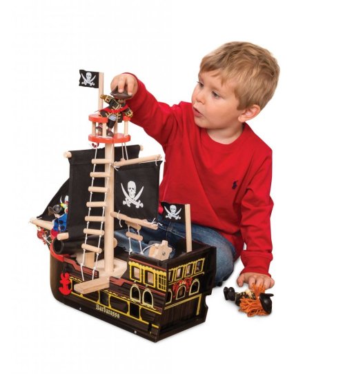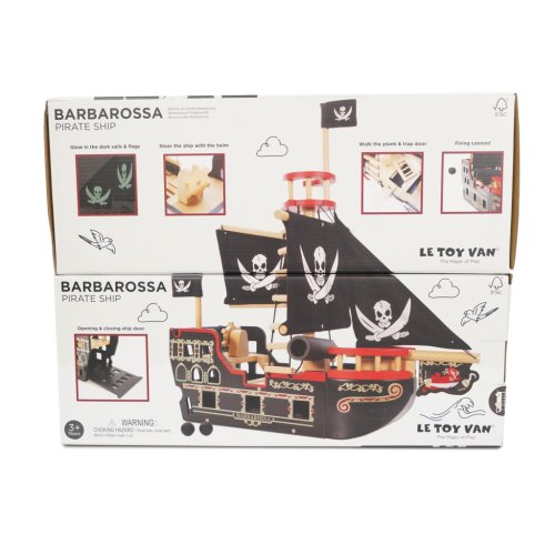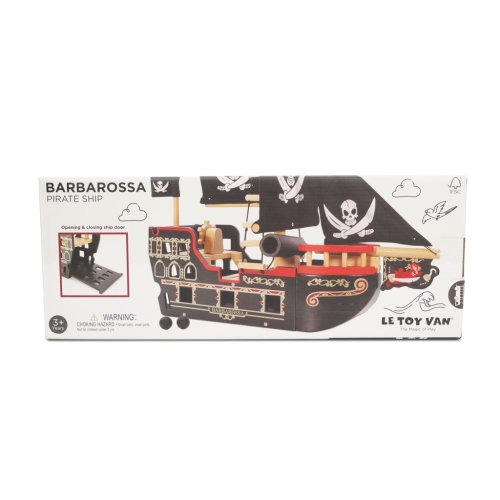 Veľkolepá Barbarossa je pripravená na plavbu! Loď je maľovaná čiernou farbou, jej čierne plachty s lebkou a prekríženými mečmi varujú, piráti sa plavia! Krásna hračka s mnohými detailmi je vyrobená z odolného a udržateľného dreva. Je plná interaktívnych funkcií, ktoré deti môžu objavovať počas predstavivej hry – vraní hniezdo, popravčia doska, lanoví, delo s guľami (strieľa vďaka pružiny), kotva s navijakom, dvere do podpalubia a otváracie zadok. Hračka bez obsahu plastu je vhodná pre figúrky do 10 cm. Hračky s účelomVšetky hračky firmy Le Toy Van sú vyrobené s cieľom - aby dlho vydržali. Dizajnované s láskou skúsenými remeselníkmi za použitia etických praktík a udržateľných materiálov, ktoré sú láskavejšie k našej planéte. Hlavné vlastnosti: vyrobené eticky z udržateľného dreva testované podľa najprísnejších štandardov maľované netoxickými farbami na báze vody inšpiruje k predstavivej hre rozvíja kognitívne zručnosti Ocenenie hračky: Right Start Best Toy Award Pirátska kolekcia: Tradičná pirátska kolekcia pre najmenších s balančnou pirátskou loďou, ale , Ktorá vyhrala ocenenie. Dizajn vytiahnutý do detailu, hračky podporujú v predstavivej hre. S hračkami aj postavičkami si deti užijú dlhé hodiny zábavy. Značka a certifikát FSC® (Forest Stewardship Council) zaručuje, že drevo, z ktorého bol produkt vyrobený, nebolo vyťažené nelegálne a pochádza z lesov obhospodarovaných šetrným či prírode blízkym spôsobom, v ktorom sú dodržiavané prísne environmentálne a sociálne požiadavky. Značka FSC® na výrobku znamená, že svojim nákupom pomáhate chrániť lesy a podporujete šetrné, zodpovedné či prírode blízke hospodárenie, vďaka ktorému sú naše lesy stabilnejšie, zdravšie, majú prirodzenú druhovú skladbu a lepšie odolávajú negatívnym následkom klimatických zmien.