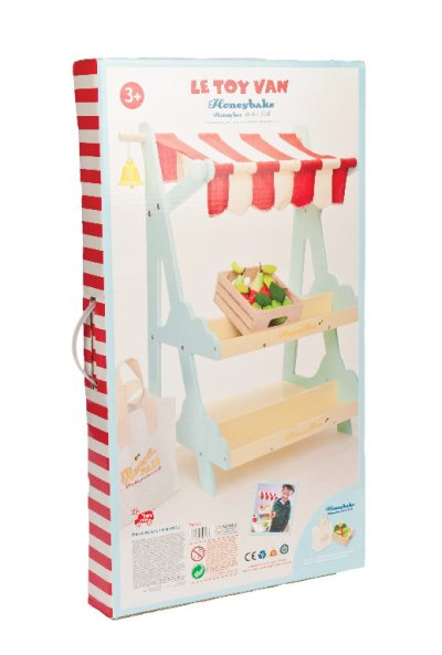 Predajný stánok je favoritom medzi produktmi Le Toy Van, nie je teda prekvapením, že vyhral niekoľko ocenení. Navrhnuté šikovnými dizajnérmi pre každodennú zábavnú hru na role. Nechýba ani nákupná taška a debnička s jablkami a hruškami. Do políc je možné uložiť aj ďalšie debničky s jedlom od Le Toy Van. Zvrchu pekný baldachýn, z boku zvonček, ktorým zákazníci môžu upútať pozornosť predajcov. Hračka deťom pomôže s rozvojom sociálnych zručností a reči, tiež sa naučí trpezlivosti. Hračky s účelomVšetky hračky firmy Le Toy Van sú vyrobené s cieľom - aby dlho vydržali. Dizajnované s láskou skúsenými remeselníkmi za použitia etických praktík a udržateľných materiálov, ktoré sú láskavejšie k našej planéte. Hlavné vlastnosti: vyrobené eticky z udržateľného FSC dreva testované podľa najprísnejších štandardov maľované netoxickými farbami na báze vody inšpiruje k predstavivej hre rozvíja kognitívne zručnosti. Tradičný dizajn s modernými detailmi deti určite bude baviť. Honeybake je kolekcia Le Toy Van, ktorá vyhrala najviac ocenení a to za dizajn, kvalitu, bezpečnosť a taktiež za vzdelávaciu a hernú hodnotu.