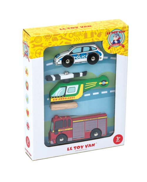 Tiesňová linka, ako vám môžem pomôcť? Drevené záchranárske autá sú už na ceste! Táto nostalgická hračka deti inšpiruje k predstavivej hre. Tri stroje z odolného kaučukového dreva - záchranná helikoptéra, policajné a hasičské auto, sú maľované netoxickými farbami na báze vody. Produkt je kompatibilný s vláčikmi a vláčikodráhami Le Toy Van. Perfektný darček pre mladých hasičov, pilotky, záchranárov a policajtky. Hračky s účelomVšetky hračky firmy Le Toy Van sú vyrobené s cieľom - aby dlho vydržali. Dizajnované s láskou skúsenými remeselníkmi za použitia etických praktík a udržateľných materiálov, ktoré sú láskavejšie k našej planéte. Hlavné vlastnosti: vyrobené eticky z udržateľného dreva testované podľa najprísnejších štandardov maľované netoxickými farbami na báze vody inšpiruje k predstavivej hre rozvíja kognitívne zručnosti Autá & stavby: Stavebná a motorická kolekcia Le Toy Van, ktorá vyhrala mnoho ocenení. Presnejšie zatiaľ vyše 15 ocenení za predstavivé autá a stavebné hračky. Podporujú detskú fantáziu, sú ideálne na predstavivú hru, rozvíjajú kreativitu a hravo zlepšujú detskú koordináciu ruka-oko.