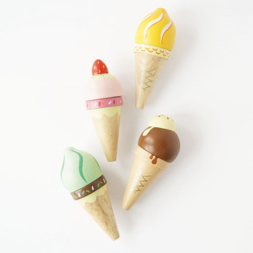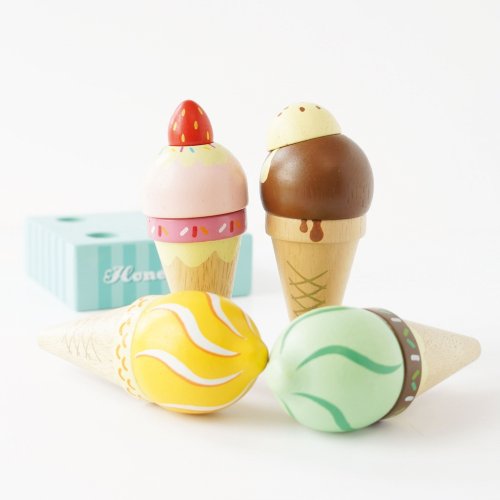 Jednu čokoládovú! S touto sladkou sadou štyroch ručne maľovaných kornútov zmrzliny budú deti môcť servírovať osvieženie pri predstavivej hre. Krásne zdobené kornúty zmrzliny sú vyrobené z masívneho kaučukového dreva, maľované realisticky s rozdielnymi detailmi a sú doplnené o robustný drevený stojan. Pri hre si deti precvičia koordináciu ruka-oko a jemnú motoriku. Hračky s účelomVšetky hračky firmy Le Toy Van sú vyrobené s cieľom - aby dlho vydržali. Dizajnované s láskou skúsenými remeselníkmi za použitia etických praktík a udržateľných materiálov, ktoré sú láskavejšie k našej planéte. Hlavné vlastnosti: vyrobené eticky z udržateľného dreva testované podľa najprísnejších štandardov maľované netoxickými farbami na báze vody inšpiruje k predstavivej hrevhodnej pre hru na role Honeybake kolekcie: Hračky v tejto kolekcii sú vhodné na objavovanie, pomôžu deťom s rozvojom predstavivosti, sociálnych a verbálnych zručností a kognitívnych. Tradičný dizajn s modernými detailmi deti určite bude baviť. Honeybake je kolekcia Le Toy Van, ktorá vyhrala najviac ocenení, a to za dizajn, kvalitu, bezpečnosť a tiež za vzdelávaciu a hernú hodnotu.