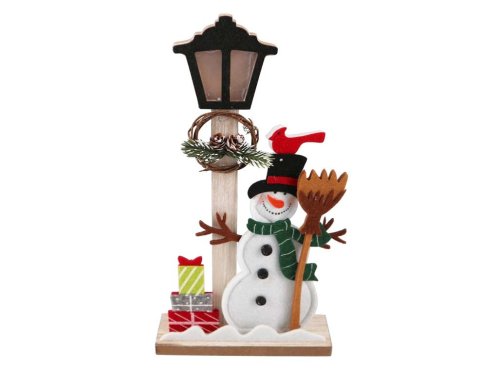 LED dekorácia drevo 145x315mm snehuliak s darčekmi u lampy na postavenie, farebná