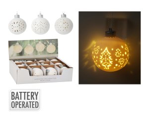 Dekoratívna LED guľa o rozmere 90×90×100 mm vyrobená z dolomitu, zdobená vyrezávanými motívmi. Jednotlivé kusy sú dodávané v mixe rôznych motívov v elegantnom bielom prevedení.