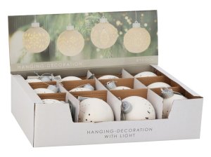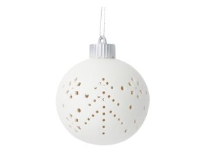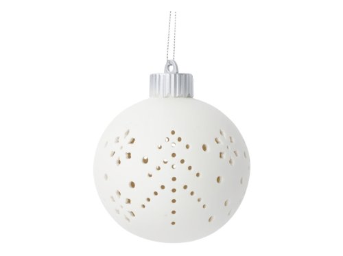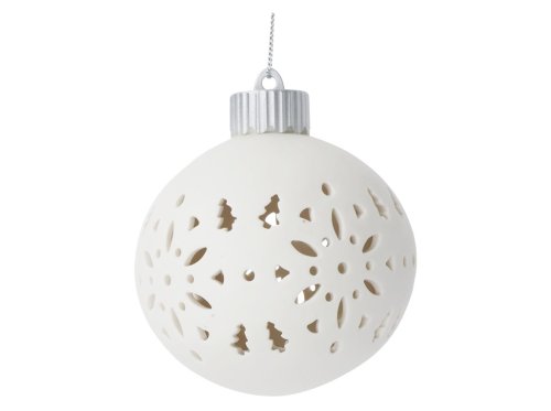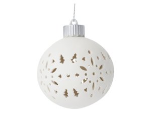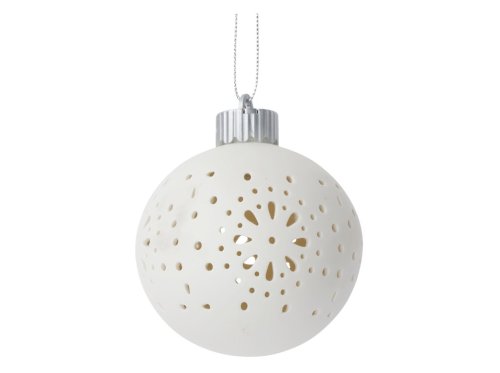 Závesná dekoračná guľa, s vyrezanými motívmi, v odtieni teplej bielej navodí príjemnú atmosféru.