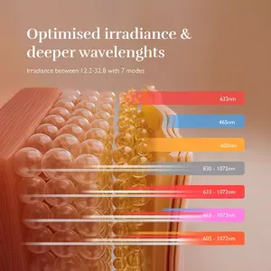 Režim 1 – Červené svetlo (633 nm): vyhladzuje vrásky, stimuluje tvorbu kolagénu a zlepšuje mikrocirkuláciu pre mladší vzhľad. Režim 2 – Modré svetlo (463 nm): bojuje proti akné, redukuje začervenanie a vyrovnáva produkciu kožného mazu pre čistejšiu pleť. Režim 3 – Jantárové svetlo (605 nm): zosvetľuje pigmentové škvrny, upokojuje pleť a zjednocuje jej tón. Režim 4 - NIR + Deep NIR (830 nm + 1072 nm): redukuje vrásky, stimuluje tvorbu kolagénu a elastínu, zlepšuje prekrvenie a pevnosť pokožky v hlbších vrstvách. Režim 5 – Červené + NIR + Deep NIR (633 nm + 830 nm + 1072 nm): pôsobí od dermis po hypodermis, cieli na pokročilé známky starnutia a podporuje bunkovú regeneráciu. Režim 6 – Purpurové svetlo (kombinácia červeného, modrého, NIR a Deep NIR): komplexne bojuje proti akné aj starnutiu pleti. Režim 7 – Tmavo oranžové svetlo (červené + jantárové + NIR + Deep NIR): zjednocuje tón, spevňuje a pozdvihuje kontúry tváre pre mladistvejší vzhľad.