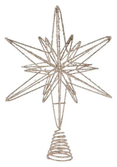 Špička na stromček v podobe hviezdy rozsvieti každý vianočný stromček príjemným a decentným svetlom. S 20 zabudovanými LED diódami vytvára pôsobivý efekt, ktorý oceníte nielen večer pri rozsvietenom stromčeku, ale aj cez deň ako dizajnový doplnok. Dizajn hviezdy patrí medzi klasické prvky vianočnej výzdoby. Elegantná farba v odtieni champagne so zlatým nádychom prináša do interiéru jemný lesk a slávnostný nádych. Výška 33 cm zaručuje, že špička bude na stromčeku krásne viditeľná a vkusne dominantná.