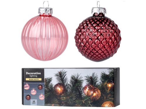 Táto LED reťaz s 10 väčšími sklenenými guľôčkami v červenej a ružovej farbe je ideálna pre vianočné dekorácie, aranžmány alebo stolnú ozdobu. LED svetlá vytvárajú príjemnú a hrejivú atmosféru. Reťaz je ľahká a ľahko sa zavesuje či umiestňuje do rôznych dekorácií. Praktické a estetické riešenie na dodanie slávnostného vzhľadu každému priestoru.