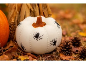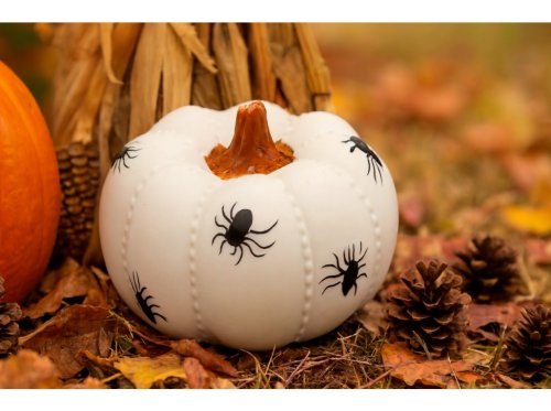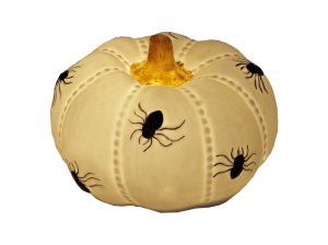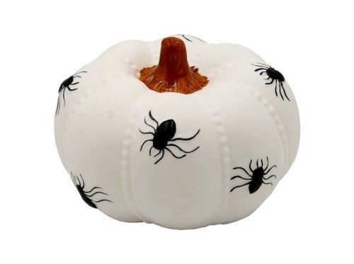 LED tekvica kameninová, biela s pavúkmi 98x126 mm