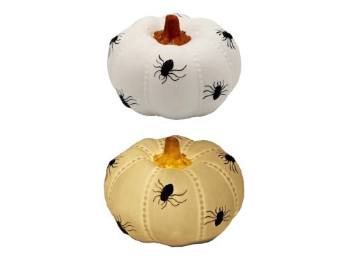 LED kameninová tekvica o rozmere 98 × 126 mm je zdobená motívom pavúkov, ideálna pre Halloween. LED svetlo poskytuje hrejivú a bezpečnú atmosféru bez otvoreného ohňa. Skvelá pre stolný aranžmán, parapet alebo malé výzdoby. Produkt na svoje fungovanie potrebuje batérie, batérie nie sú súčasťou balenia.