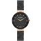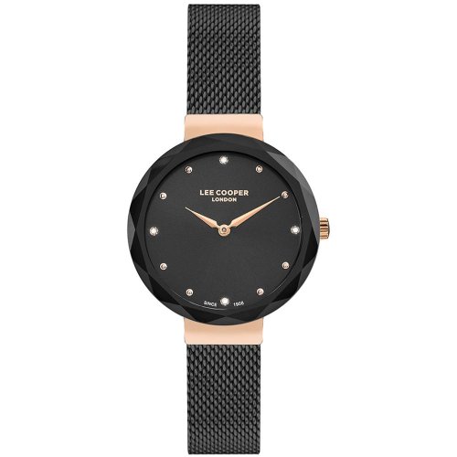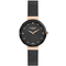 Dámske náramkové hodinky Napájanie z batérie Priemer puzdra 33,0 mm Puzdro v tvare kruhu Kovové puzdro Ružové zlato farba puzdra Kovový ťah ČIERNE farba ťahu Ručičkový ciferník Čierna farba ciferníka Ciferník s dvanástimi indexmi Materiál skla - minerálne sklo Odolné