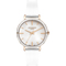 Dámske náramkové hodinky Napájanie z batérie Priemer puzdra 34,0 mm Puzdro v tvare kruhu Kovové puzdro Ružové zlato farba puzdra Kožený ťah Biela farba ťahu Ručičkový ciferník Biela farba ciferníku Ciferník s dvanástimi indexmi Materiál skla - minerálne sklo
