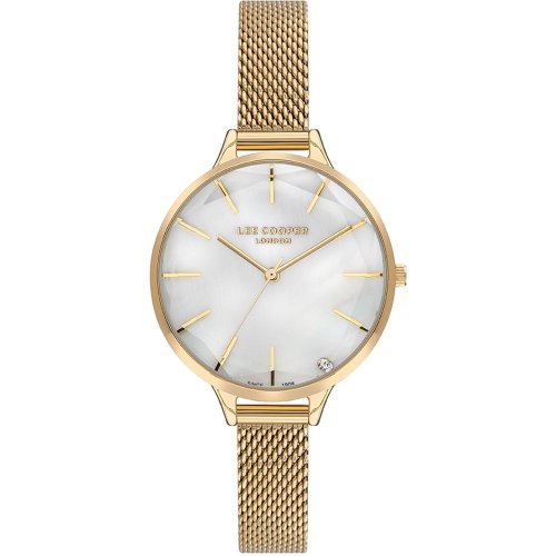 Dámske náramkové hodinky Napájanie z batérie Priemer puzdra 35,0 mm Puzdro v tvare kruhu Kovové puzdro Zlatavá farba puzdra Kovový ťah Zlatavá farba ťahu Ručičkový ciferník Biela farba ciferníka Ciferník s dvanástimi indexmi Materiál skla - minerálne sklo