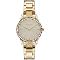 Dámske náramkové hodinky Napájanie z batérie Priemer puzdra 33,0 mm Puzdro v tvare kruhu Kovové puzdro Zlatavá farba puzdra Kovový ťah Zlatavá farba ťahu Ručičkový ciferník Zlatavá farba ciferníku Ciferník s dvanástimi indexmi Materiál skla - minerálne sklo