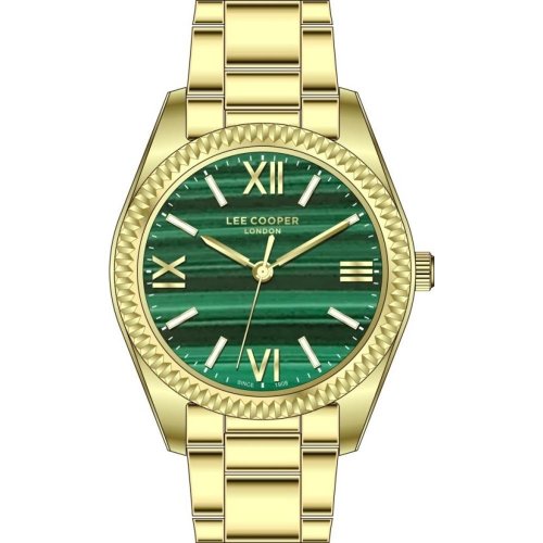 Dámske náramkové hodinky Napájanie z batérie Priemer puzdra 32,0 mm Puzdro v tvare kruhu Kovové puzdro Zlatavá farba puzdra Kovový ťah Zlatavá farba ťahu Ručičkový ciferník Zelená farba ciferníku Ciferník s dvanástimi indexmi Materiál skla - minerálne sklo