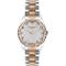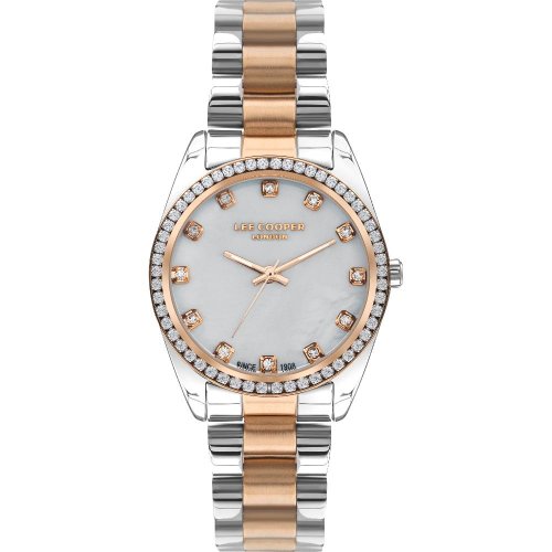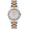 Dámske náramkové hodinky Napájanie z batérie Priemer puzdra 34,0 mm Puzdro v tvare kruhu Kovové puzdro Strieborná/zlatá farba puzdra Kovový ťah Strieborná/zlatá farba ťahu Ručičkový ciferník PERLEŤOVÁ farba ciferníku Ciferník s dvanástimi indexmi