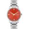Pánske náramkové hodinky Napájanie z batérie Priemer puzdra 44,0 mm Puzdro v tvare kruhu Kovové puzdro Strieborná farba puzdra Kovový ťah Strieborná farba ťahu Ručičkový ciferník Oranžová farba ciferníka Ciferník s dvanástimi indexmi Materiál skla - minerálne sklo