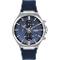 Pánske náramkové hodinky Napájanie z batérie Priemer puzdra 45,0 mm Puzdro v tvare kruhu Kovové puzdro Strieborná farba puzdra Plastový ťah TMAVO MODRÁ farba ťahu Ručičkový ciferník TMAVO MODRÁ farba ciferníka Ciferník s dvanástimi indexmi Materiál pri skle - minerál
