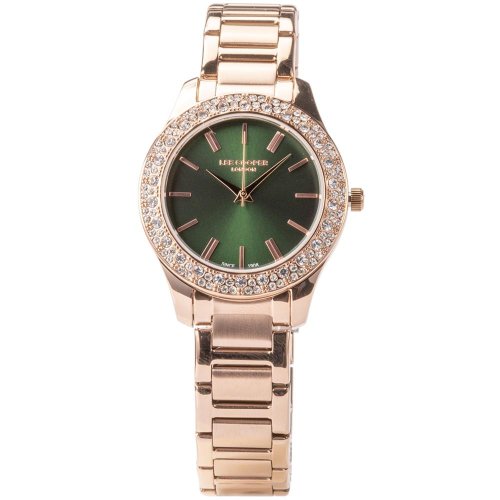 Dámske náramkové hodinky Napájanie z batérie Priemer puzdra 35,0 mm Puzdro v tvare kruhu Kovové puzdro Ružové zlato farba puzdra Kovový ťah Ružové zlato farba ťahu Ručičkový ciferník Zelená farba ciferníku Ciferník s dvanástimi indexmi Materiál skla - minerálne sklo Odol