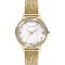 Dámske náramkové hodinky Napájanie z batérie Priemer puzdra 35,0 mm Puzdro v tvare kruhu Kovové puzdro Zlatavá farba puzdra Kovový ťah Zlatavá farba ťahu Ručičkový ciferník PERLEŤOVÁ farba ciferníka Ciferník s dvanástimi indexmi Materiál skla - minerálne sklo