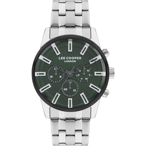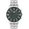 Pánske náramkové hodinky Napájanie z batérie Priemer puzdra 45,0 mm Puzdro v tvare kruhu Kovové puzdro Strieborná farba puzdra Kovový ťah Strieborná farba ťahu Ručičkový ciferník Zelená farba ciferníku Ciferník s dvanástimi indexmi Materiál skla - minerálne sklo
