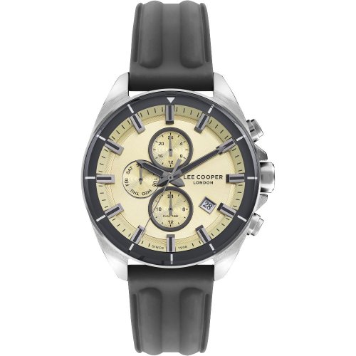 Pánske náramkové hodinky Napájanie z batérie Priemer puzdra 46,0 mm Puzdro v tvare kruhu Kovové puzdro Strieborná farba puzdra Plastový ťah Šedá farba ťahu Ručičkový ciferník Zlatavá farba ciferníka Ciferník s dvanástimi indexmi Materiál skla - minerálne sklo