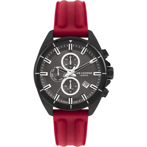 Pánske náramkové hodinky Napájanie z batérie Priemer puzdra 46,0 mm Puzdro v tvare kruhu Kovové puzdro ČIERNA farba puzdra Plastový ťah Červená farba ťahu Ručičkový ciferník Čierna farba ciferníka Ciferník s dvanástimi indexmi Materiál skla - minerálne sklo Odolné proti vode
