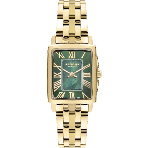 Dámske náramkové hodinky Napájanie z batérie Priemer puzdra 32,0 mm Puzdro v tvare obdĺžnika Kovové puzdro Zlatavá farba puzdra Kovový ťah Zlatavá farba ťahu Ručičkový ciferník Zelená farba ciferníka Ciferník s dvanástimi indexmi Materiál skla - minerálne sklo