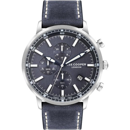 Pánske náramkové hodinky Napájanie z batérie Priemer puzdra 45,0 mm Puzdro v tvare kruhu Kovové puzdro Strieborná farba puzdra Kožený ťah Modrá farba ťahu Ručičkový ciferník Modrá farba ciferníku Ciferník s dvanástimi indexmi Materiál skla - minerálne sklo Odolné proti