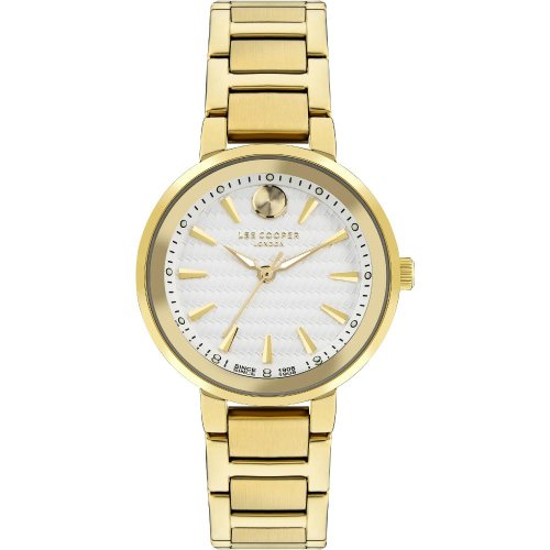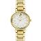 Dámske náramkové hodinky Napájanie z batérie Priemer puzdra 32,0 mm Puzdro v tvare kruhu Kovové puzdro Zlatistá farba puzdra Kovový ťah Zlatistá farba ťahu Ručičkový ciferník Biela farba ciferníka Ciferník s dvanástimi indexmi Materiál skla - minerálne sklo