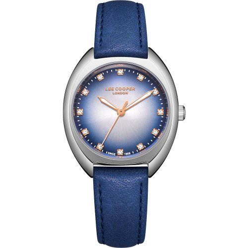 Dámske náramkové hodinky Napájanie z batérie Priemer puzdra 30,0 mm Puzdro v tvare oválu Kovové puzdro Strieborná farba puzdra Kožený ťah Modrá farba ťahu Ručičkový ciferník Modrá farba ciferníku Ciferník s dvanástimi indexmi Materiál skla - minerálne sklo Odolné proti