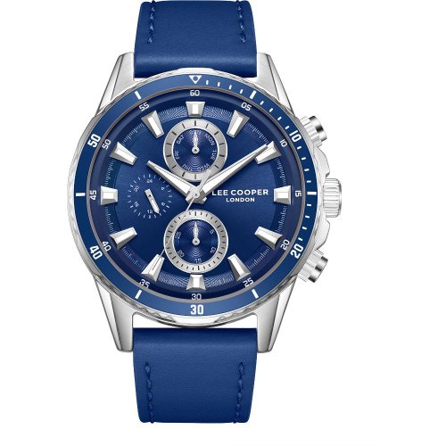Pánske náramkové hodinky Napájanie z batérie Puzdro v tvare kruhu Kovové puzdro Strieborná farba puzdra Kožený ťah TMAVO MODRÁ farba ťahu Ručičkový ciferník TMAVO MODRÁ farba ciferníka Materiál skla - minerálne sklo Odolné proti vode pri bežnom nosení