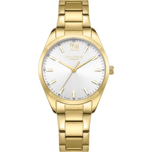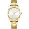 Dámske náramkové hodinky Napájanie z batérie Priemer puzdra 21,0 mm Puzdro v tvare kruhu Kovové puzdro Zlatistá farba puzdra Kovový ťah Zlatistá farba ťahu Ručičkový ciferník Strieborná farba ciferníka Ciferník s dvanástimi indexmi Materiál skla - minerálne sklo
