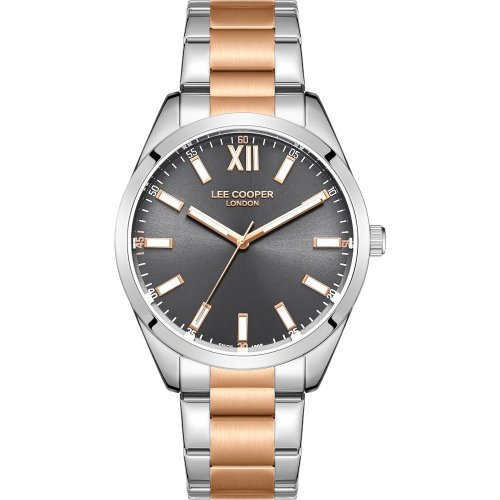 Dámske náramkové hodinky Napájanie z batérie Priemer puzdra 41,0 mm Puzdro v tvare kruhu Kovové puzdro Strieborná/zlatá farba puzdra Kovový ťah Strieborná/zlatá farba ťahu Ručičkový ciferník Šedá farba ciferníku Ciferník s dvanástimi indexmi
