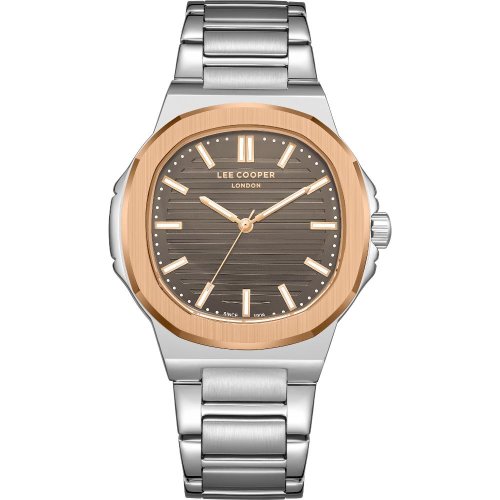 Pánske náramkové hodinky Napájanie z batérie Priemer puzdra 45,0 mm Puzdro v tvare štvorca Kovové puzdro Ružové zlato farba puzdra Kovový ťah Strieborná farba ťahu Ručičkový ciferník Šedá farba ciferníku Ciferník s dvanástimi indexmi Materiál skla - minerálne sklo