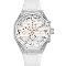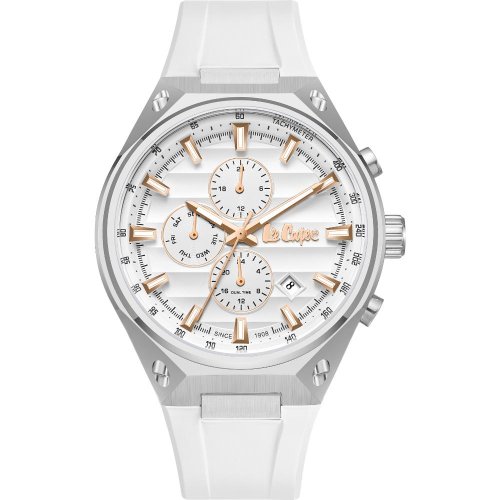 Pánske náramkové hodinky Napájanie z batérie Priemer puzdra 45,0 mm Puzdro v tvare kruhu Kovové puzdro Strieborná farba puzdra Kožený ťah Biela farba ťahu Ručičkový ciferník Strieborná farba ciferníku Ciferník s dvanástimi indexmi Materiál skla - minerálne sklo