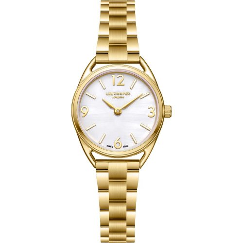 Dámske náramkové hodinky Napájanie z batérie Priemer puzdra 26,0 mm Puzdro v tvare kruhu Kovové puzdro Zlatavá farba puzdra Kovový ťah Zlatavá farba ťahu Ručičkový ciferník PERLEŤOVÁ farba ciferníka Ciferník s dvanástimi indexmi Materiál skla - minerálne sklo