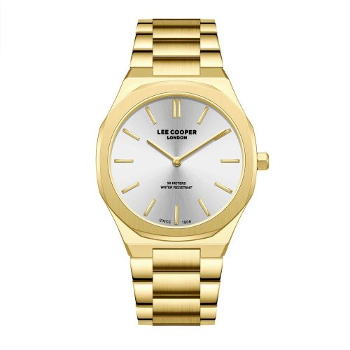 Pánske náramkové hodinky Napájanie z batérie Priemer puzdra 42,0 mm Puzdro v tvare štvorca Kovové puzdro Zlatistá farba puzdra Kovový ťah Zlatistá farba ťahu Ručičkový ciferník Strieborná farba ciferníka Ciferník s dvanástimi indexmi Materiál skla - minerálne