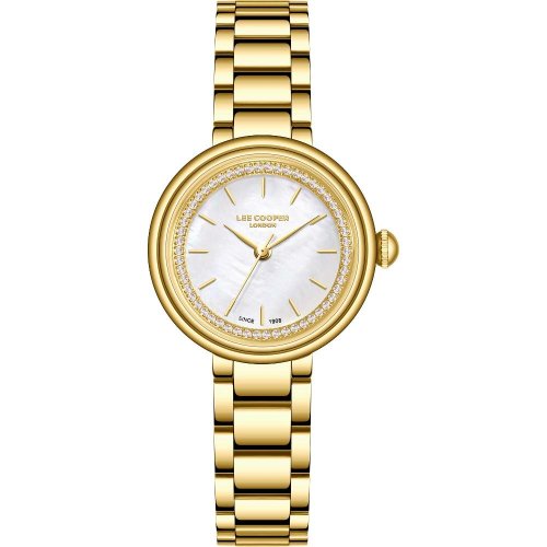 Dámske náramkové hodinky Napájanie z batérie Priemer puzdra 28,0 mm Puzdro v tvare kruhu Kovové puzdro Zlatavá farba puzdra Kovový ťah Zlatavá farba ťahu Ručičkový ciferník PERLEŤOVÁ farba ciferníka Ciferník s dvanástimi indexmi Materiál skla - minerálne sklo