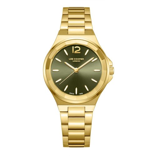 Dámske náramkové hodinky Napájanie z batérie Priemer puzdra 33,0 mm Puzdro v tvare kruhu Kovové puzdro Zlatistá farba puzdra Kovový ťah Zlatistá farba ťahu Ručičkový ciferník Zelená farba ciferníka Ciferník s dvanástimi indexmi Materiál skla - minerálne sklo
