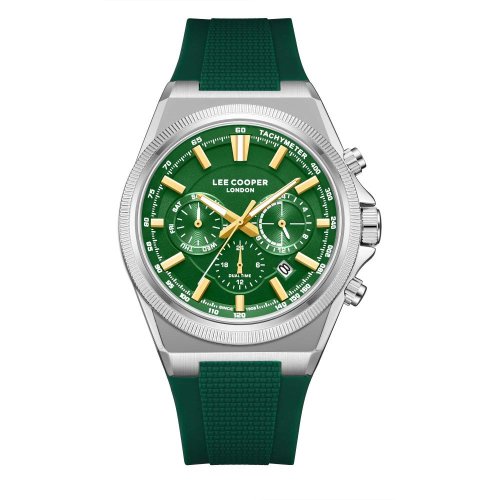 Pánske náramkové hodinky Napájanie z batérie Priemer puzdra 43,0 mm Puzdro v tvare kruhu Kovové puzdro Strieborná farba puzdra Zelená farba ťahu Ručičkový ciferník Zelená farba ciferníka Ciferník s dvanástimi indexmi Materiál skla - minerálne sklo Odolné proti vode pri bežnom