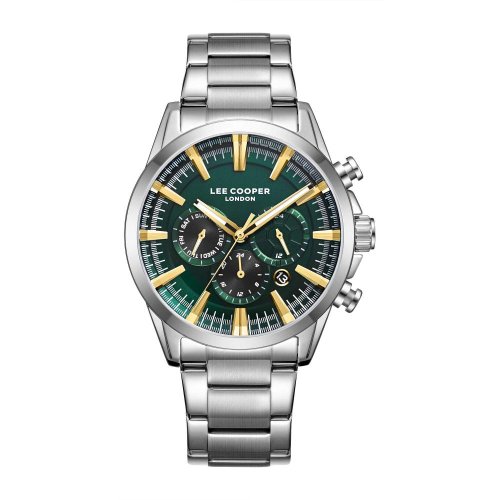 Pánske náramkové hodinky Napájanie z batérie Priemer puzdra 43,0 mm Puzdro v tvare kruhu Kovové puzdro Strieborná farba puzdra Kovový ťah Strieborná farba ťahu Ručičkový ciferník Zelená farba ciferníku Ciferník s dvanástimi indexmi Materiál skla - minerálne sklo Odol