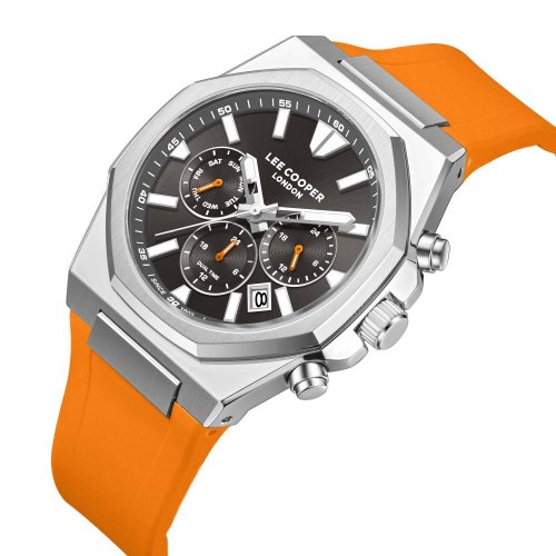 Pánske náramkové hodinky Napájanie z batérie Priemer puzdra 44,0 mm Puzdro v tvare osemhranu Kovové puzdro Strieborná farba puzdra Oranžová farba ťahu Ručičkový ciferník Šedá farba ciferníka Ciferník s dvanástimi indexmi Materiál skla - minerálne sklo Odolné proti
