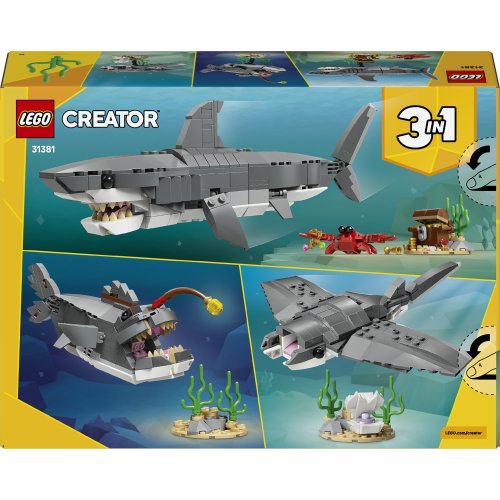 LEGO® 31381 Creator 3v1 Divoký žralok a truhla s pokladom je stavebnica určená pre deti od 8 rokov, ktorá ponúka trojicu modelov inšpirovaných podmorským svetom. Súprava obsahuje celkom 379 dielikov, z ktorých možno zostaviť pohyblivého žraloka s realistickými detailmi ako sú zuby, oči a plutvy, a to všetko v kombinácii s malou truhlou s pokladom, morskými rastlinami a červeným krabom. Vďaka konštrukcii na podstavci je možné model vystaviť ako dekoráciu, čím sa zvyšuje jeho atraktivita aj pre zberateľov a nadšencov do morských tvorov.