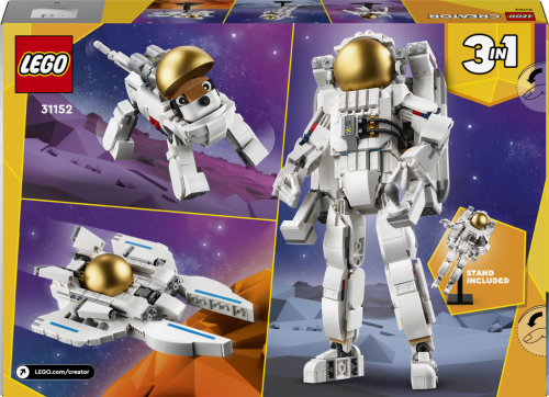 • 3 vesmírne hračky LEGO® v 1 krabici – Deti od 9 rokov, ktoré milujú vesmír, si so stavebnicou LEGO Creator 3 v 1 Astronaut postavia a prestavia 3 sady modelov z rovnakých kociek• Nekonečné možnosti hrania vo vesmíre – Deti sa vydajú na odvážne dobrodružstvá medzi hviezdami s 3 rôznymi vesmírnymi modelmi: Figúrkou astronauta, vesmírnym psom a vesmírnym Viperom• Pohyblivé vesmírne figúrky – Model astronauta má pohyblivé nohy, chodidlá, paže a prsty a vesmírny pes pohybuje chvostom a nohami a deti si ich tak upravia podľa vlastnej fantázie• Výstavné modely – Každý z 3 vesmírnych modelov LEGO® má podstavec z kociek, aby si ho deti mohli vystaviť v izbičke, až galaktické dobrodružstvo skončí• Narodeninový darček s tematikou vesmíru – Táto stavebnica 3 v1 prináša staviteľský a herný zážitok. Predstavuje krásny darček k narodeninám a deti si s ňou užijú hodiny akčného hrania • Nový spôsob stavania – Vykonajte deti na ich ďalšom staviteľskom dobrodružstve intuitívnou aplikáciou s návodom LEGO® Builder. Umožnenie im ukladať si stavebnice, sledovať postup a približovať a otáčať modely v 3D, zatiaľ čo na nich pracujú • Hračky LEGO® Creator 3 v 1 – S každou zo stavebníc 3 v 1 si deti postavia 3 rôzne modely inšpirované ich záujmami, vrátane zvierat vozidiel a prepracovaných mestských scén• Stavajte a hrajte sa – Táto stavebnica LEGO® sa skladá zo 647 dielikov a súčasťou je model astronauta, ktorý meria cez 27 cm na výšku