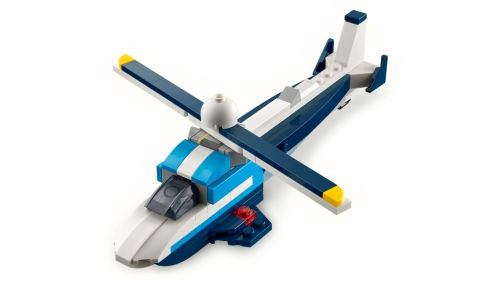 So stavebnicou LEGO® Creator 3 v 1 Pretekárske lietadlo si chlapci a dievčatá od 7 rokov postavia a prestavia 3 rôzne vozidlá z rovnakých kociek Deti sa vydajú na dobrodružstvo vo vzduchu s 3 rôznymi možnosťami stavania (modely nemožno zostaviť súčasne): model pretekárskeho lietadla a model tryskáča kolesá, model tryskáča má pohyblivé kolesá a model helikoptéry má otáčajúci sa listový rotor Všetky 3 modely LEGO® si môžete vystaviť na podstavci z kociek