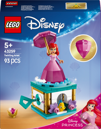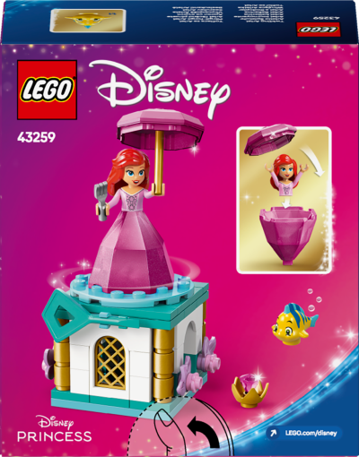 Potešte dievčatá a chlapcov od 5 rokov, ktorí milujú kreatívne hranie, zábavnou stavebnicou Točiaca sa Ariel inšpirovanou filmom Malá morská víla od štúdia Disney Stavebnica obsahuje stojan s otočnou podložkou a kľúčom, minibábiku LEGO® Disney Ariel v meniacich sa „diamantových“ šatách podstavcami, roztočte podložku a Ariel a potom vložte minibábiku LEGO® Disney do „diamantových" šiat a dáždnik použite ako veko. Vystavte si stavebnicu s Ariel, vidličkou a dáždnikom, pridajte na podstavec Šupinku a „diamant" alebo si vymyslite nové príbehy s Ariel a Šupin