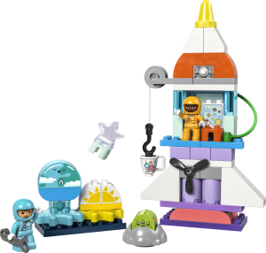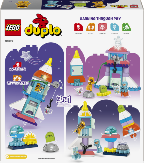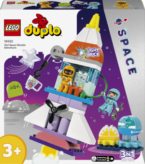 • Prestaviteľný model raketoplánu – Potešte malých astronautov od 3 rokov stavebnicou LEGO® DUPLO® Vesmírne dobrodružstvo s raketoplánom 3 v 1• Krabica plná zábavy – Súčasťou stavebnice je rad farebných kociek a doplnkov na hranie a figúrka LEGO® DUPLO® mimozemšťan sa s ňou vydajú na nekonečné vesmírne dobrodružstvá• Hračka pre rozvoj zručností – Deti pri otáčaní navijaku, roztáčaní vrtule a otváraní dverí zdokonalia svoje jemné motorické schopnosti a pri stavaní vesmírnych vozidiel prehĺbia kreatívne myslenie• Súčasťou je svetelná kocka – Zábavná balenie) pozdvihne vesmírnu stavebnicu na úplne novú úroveň• Vesmírny darček pre malé deti – Urobte radosť malým astronautom od 3 rokov a darujte im vzdelávaciu hračku, ktorá rozvíja kreatívne hranie príbehov• Kvalitný výrobok pre malých staviteľov – Kocky a dieliky z tejto stavebnice LEGO® DUPLO ® raketoplánu púšťame na zem, drvíme, krútime, zahrievame a analyzujeme, aby sme zaistili, že spĺňajú prísne normy týkajúce sa bezpečnosti detí• Podporte detskú zvedavosť – Stavebnice LEGO® DUPLO® rozvíjajú kľúčové zručnosti malých staviteľov a prehlbujú ich záujem o Zem i o vesmír kociek pre úžasné herné zážitky - Stavebnica sa skladá z 58 dielikov a súčasťou je model raketoplánu, ktorý meria cez 35 cm na výšku, 18 cm na dĺžku a 19 cm na šírku